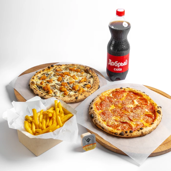 Пицца Жюльен 23 + Пепперони 23 см + Добрый Кола 1 л + Фри 300 гр + соус