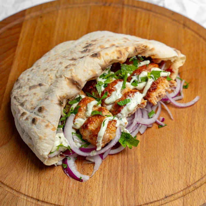 Порция сочного кебаба из курицы в свежеиспечённом хлебе собственного производства, фирменный чесночный соус, красный лук, петрушка.