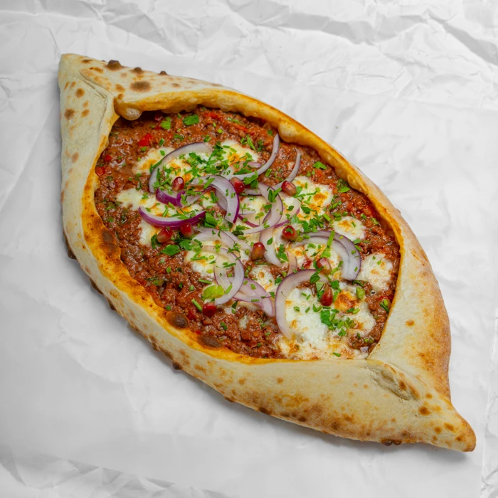 Блюдо турецкой кухни в форме лодочки с сочной начинкой из мраморной говядины, в сочетании с болгарским перцем и томатным соусом с добавлением смеси специй. Сыр моцарелла, свежая петрушка и сладкий красный лук. Готовится в итальянской печи на дровах.