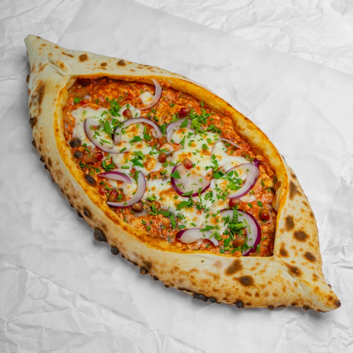 Блюдо турецкой кухни в форме лодочки с сочной начинкой из рубленного куриного филе, свежих шампиньонов, оливкового масла Extra Virgin, томатного соуса, смеси специй. Сыр моцарелла, свежая петрушка и сладкий красный лук. Готовится в итальянской печи на дровах.