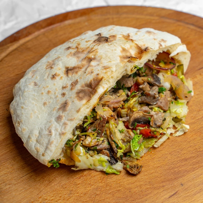 Хлеб, выпеченный в дровяной печи,свиная шея в специальном маринаде, ароматные шампиньоны, спелые помидоры, маринованные корнишоны, нежная пекинская капуста, сладкий красный лук, томатный и чесночный соус, свежая петрушка.
