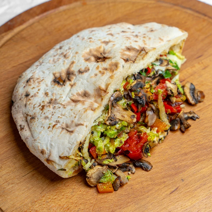 Хлеб, выпеченный в дровянной печи, ароматные шампиньоны, спелые помидоры, ароматные шампиньоны, сливочный сыр моцарелла, нежная пекинская капуста, сладкий красный лук, томатный и чесночный соус, свежая петрушка