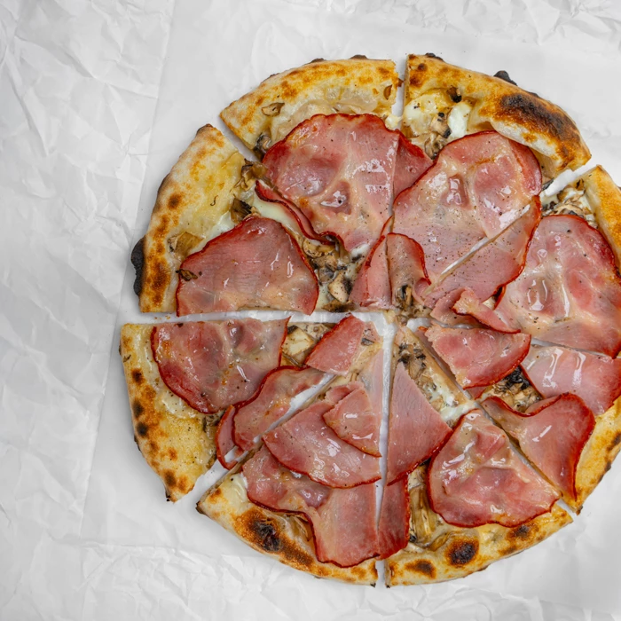 Тонкое неаполитанское тесто, тандем двух сыров моцареллы и чеддера делают эту пиццу неповторимо нежной. Ветчина, поливается оливковым маслом Extra Virgin.