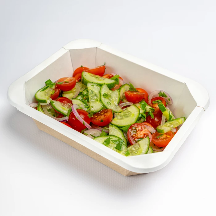 Спелые черри, хрустящий огурчик, сладкий красный лук, свежемолотый чёрный перец, соль, свежая петрушка, оливковое масло Extra Virgin.